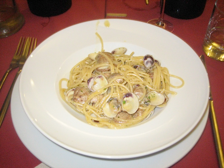 Welcome to Italy: perfect, crisp white wine; a spaghetti alle vonghole that features the tiniest, firmest, most perfect clams I’ve ever had in this personal favorite dish; and then for the next course platters of stuffed squid of an unusual variety, with fist-sized, barrel-shaped bodies and stubby tentacles. The squid are accompanied by peas in a salty, complex tomato broth, studded with chunks of diced squid. All of us, led by our hosts and Italian friends, are requesting basket after basket of the plain, sober white bread offered by the restaurant, and mopping every platter clean. Double espressos all around, and somehow we’ve killed two hours here – we have to be on stage in 5 minutes. We whisk back through the passageways, onto the stage, and the second half of the night begins.