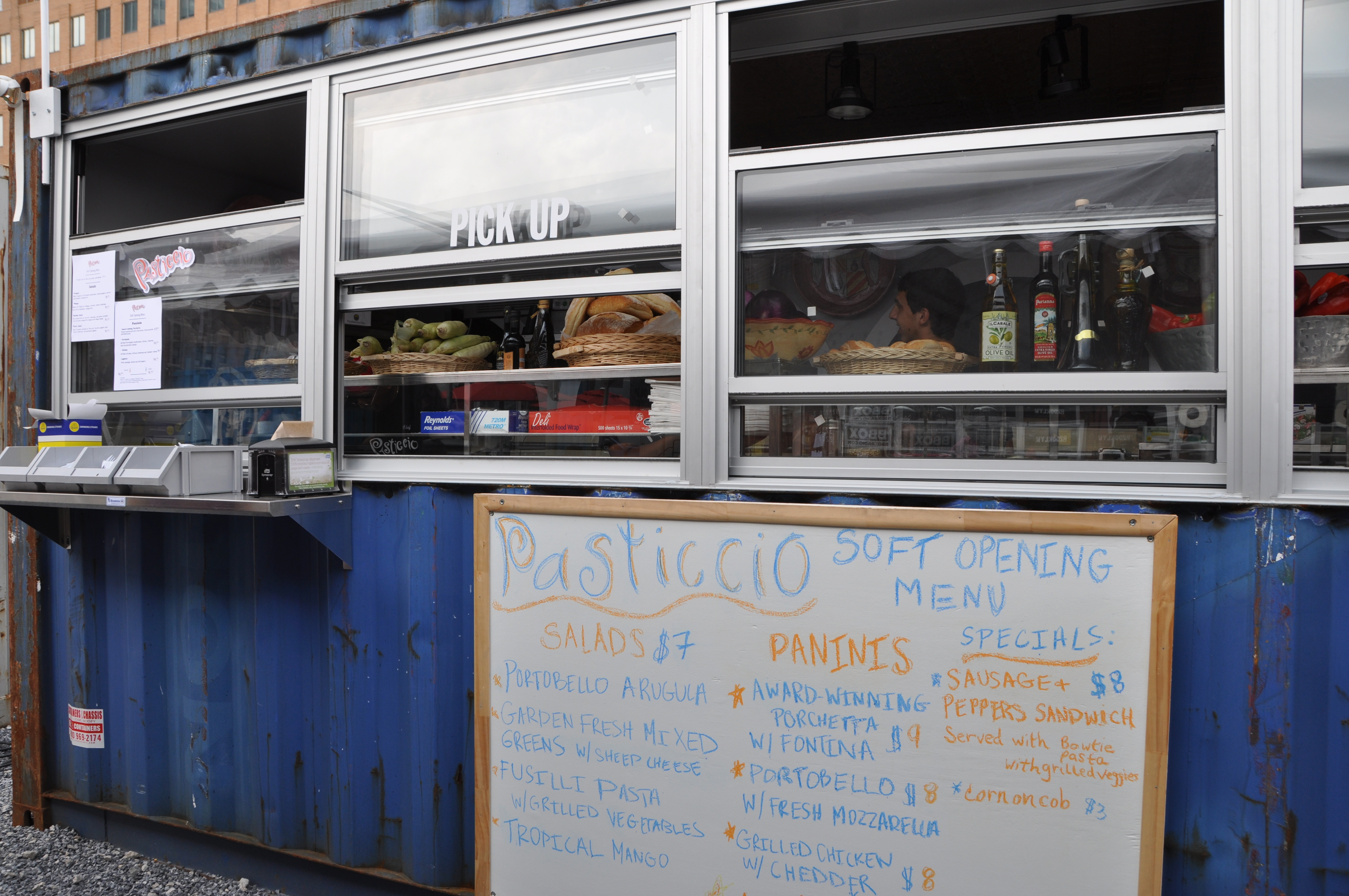 DeKalb Market is open year-round, seven days a week, from 8 a.m. to 10 p.m. daily. While weekends bustle, during the week things are still quiet. However, shop owners are optimistic that once school reopens there will be increased foot traffic from students and office workers around the area who will form their lunch and dinner crowd. And after all, it’s still early days for the DeKalb Market businesses, many of whom are still settling in; painting their logos on the outside of the containers, and testing their food offerings. Pasticcio NYC are awaiting more kitchen equipment, and aim to serve fresh pasta, sauces and mozzarella made on site in a full kitchen in a few weeks, says Nina Maurello, who together with her husband Nicola used to run Pasticcio restaurants in Murray Hill and Queens. Their trial menu comprises of salads, paninis and bruschetta made on a special oven from Italy. They also have a professional grill up and running behind their container where they grill seasonal vegetables, and will morph the area behind their container into a little “courtyard” with picnic tables.