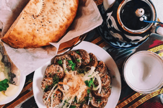 In many cases that means skewers of lamb belly, rib and meatballs; french fries dusted with garlic and herbs; lamb noodle soups with rustic, wobbly hand-made noodles and hunks of root vegetables floating in a lamby clear broth that cures what ails you; lamb pies with scallions; steamed lamb or pumpkin dumplings called manti, fat rounds of fresh bread; and platters of pickled eggplant, cabbage, green tomatoes or slender slivers of carrot, all topped with flavored vinegars or a ruddy red homemade chili paste.