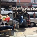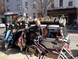 Strolling down Bedford Avenue in Williamsburg this bright Saturday morning I ran across Davad Cokonis, a surfer who splits his time between Cape Cod and Carroll Gardens. When in town he often sells merchandise he’s collected on the streets on weekends, displaying the wares–including several extremely well-priced vintage bikes–on or near his 1991 silver Volvo station wagon. A recent find for Cokonis is the sign from Joe’s Restaurant, the decades-old, diner-y breakfast and lunch spot that recently closed at 349 Court Street, near Union. Cokonis, who lives nearby and often parts his mobile market on Court Street, told he was walking by as the new owners, who are building out a yogurt shop, were getting rid of the sign.