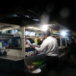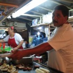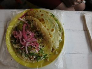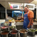 Thumbs up indeed: This taco truck, parked each night after 5 pm with several others outside a farmacia near Basilio Badillo, Puerto Vallarta’s main drag, had an impressive selection of salsa and gave us our first taste of the “volcano” taco. Here that was an al pastor (roast pork, sliced by hand from a spit) taco with a mound of melty cheese and pico de gallo. Which doesn’t really look like a volcano–which still dot Mexico–but no matter, it was crazy delicious.