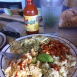 Homemade chilaquiles with tomatillo salsa and more of those pink beans, which even tiny bodegas sell in homey tubs precooked (along with rice, salsa, cabbage salad and guacamole.) Note the Valentina hot sauce, made just up the road in Guadalajara. Like the rest of the hot sauces from the region, it’s thick and brick red and made with dried red chiles.
