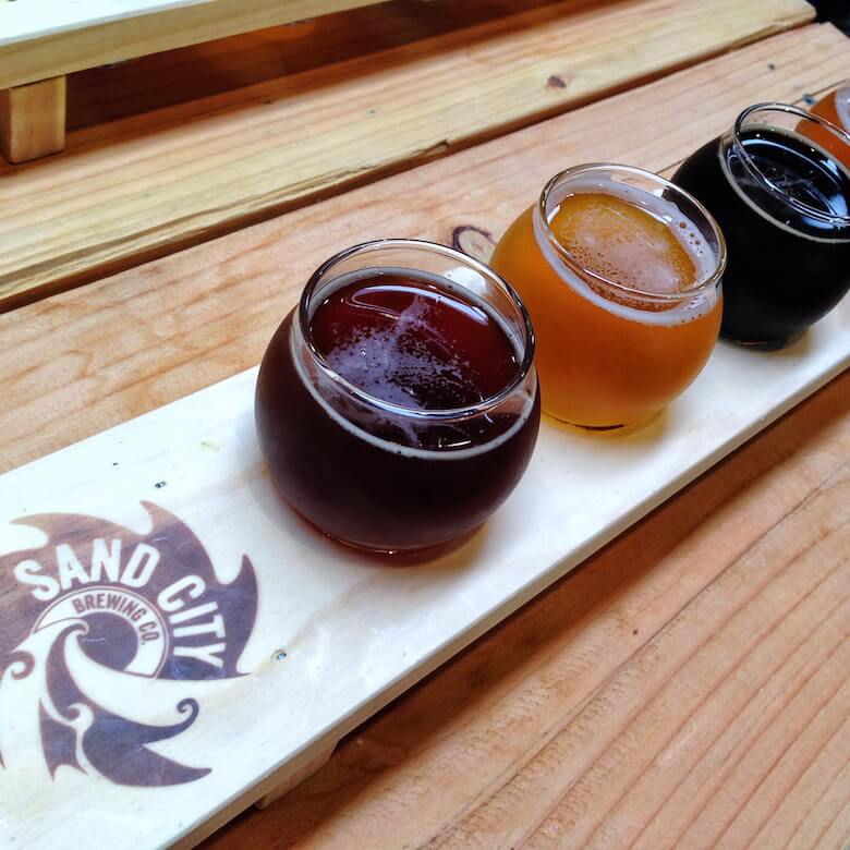 They’re open seven days a week and beers are available in flights, 5- or 13-ounce pours or pints (if you buy a Sand City pint glass). All ten taps are usually flowing and their New England Style IPAs stand out, though we’ve never had a bad beer here regardless of style. If you’re not in an IPA mood, the Southdown stout is rich and chocolatey with a hint of coffee bitterness to balance everything out. Free pretzel rods are the only food available—which really hit the spot mid-flight—but there are plenty of restaurants within walking distance. Credit cards are accepted, and they usually have a few freshly canned options to take home with you.