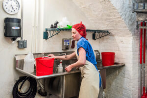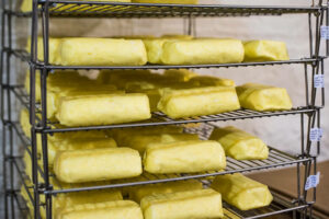 To say a cheese is washed is to overstate the process. The alcohol content of wine is high enough to kill the ambient bacteria in the caves that make the cheese what it is. Thus Brown and his team diluted the wine and apply the wash with a paint brush.