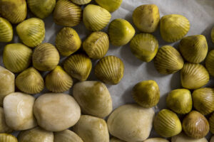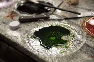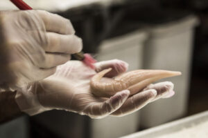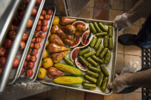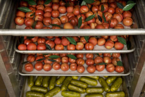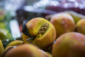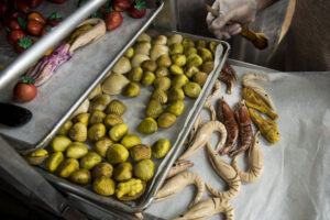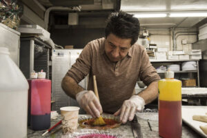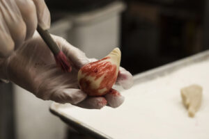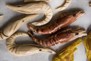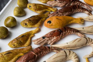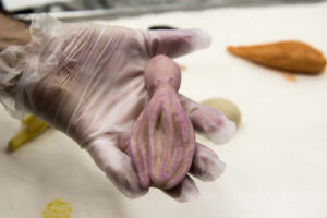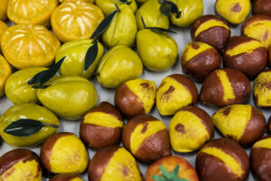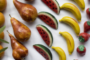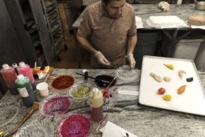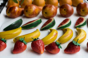 There is something very special about this talent, though, as he mixes food coloring in various plates and uses paper towels to dab his paint brushes, accessing just the right color and brush effect for each figure. He molds lifelike figs by hand with ease, using the handle of a brush to make indents, creating notches to mimic leaves. If you ask him to work more slowly so that you can see more of his process, he physically can’t—his mastery and muscle memory make him move at a quick pace.