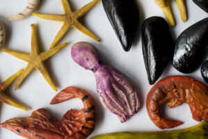 It’s Christmas season now, though. There are stacks of panettone, cellophane-wrapped platters of sprinkled struffoli, biscotti in the case and cheesecakes in the fridge. Massive rainbow cookie cakes are each topped with a smaller rainbow cookie, calling my name as well as those of small children who gaze longingly at them. The whole place is decked out for the holiday, but there’s one very special item on their menu: Feast of the Seven Fishes marzipan.