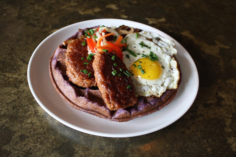 The Longanisa Egg & Waffle is a heartfelt and thoughtfully constructed dish. In addition to the waffle being gluten free (it is comprised of tapioca and rice flour), its main flavor component is derived from ube, a yam native to the Philippines. At the market, shoppers may mistake the starchy root vegetable for taro; however, its uniqueness lies in the vibrant, eye-catching purple hue that exists within. It is possible some New Yorkers will experience a purple Filipino waffle prepared with canned ube or ube paste extract. According to Thach, it is clear when restaurants use extract because it tastes like a waffle, but purple. Jo’s recipe carefully incorporates fresh ube delivered on site from a local produce company, and the result is their original fresh gluten-free ube waffle mix. When prepared, the waffle is crispy and crunchy on the outside, while maintaining a moist, spongy interior.