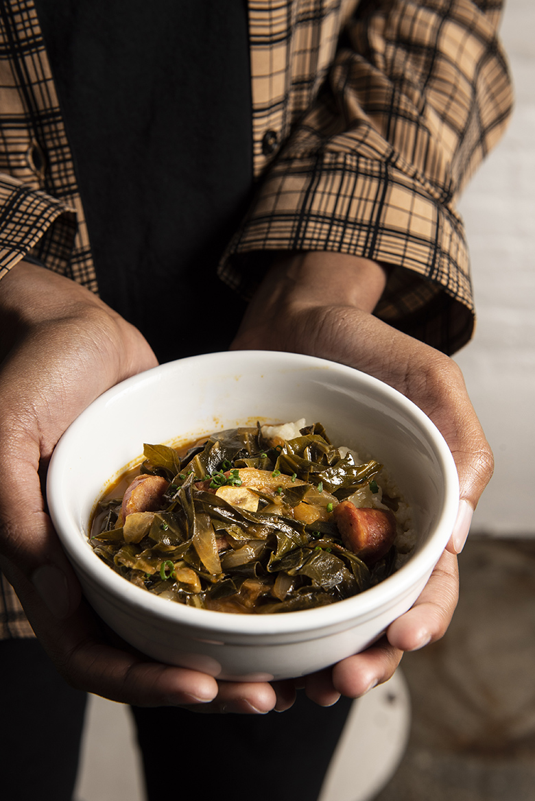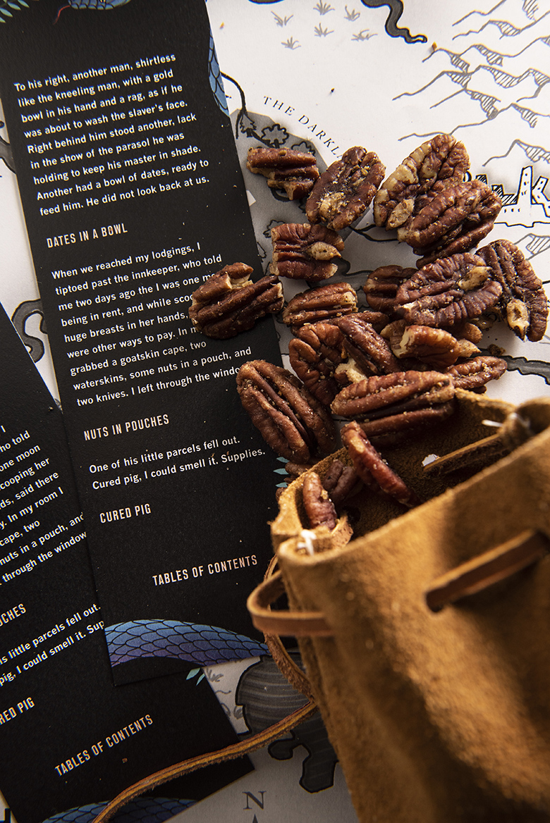 Leading up to the Black Leopard, Red Wolf dinner, I’d filled the blank back pages of a hardcover copy of the book with dozens of promising edible excerpts. Masuku beer (brewed from wild sugar plums), goat liver, the slice of a knife through melon, even an assassin’s body dissolving into wisps of ash. For the scenes that made it to the table that night, we sought out antelope steaks, millet, sorghum, and smoked African fish for a Thai-and-Norwegian-inspired soup, its scene dictating to us: she smelled like fish and lemongrass. We served shards of chicken skin atop a soft-cooked egg, blood sausage with milk and berries, ugali (cornmeal) porridge, loose like grits, topped with coins of spiced crocodile sausage, each dish aspiring to amplify the experience of the text and be lifted by the text in return.