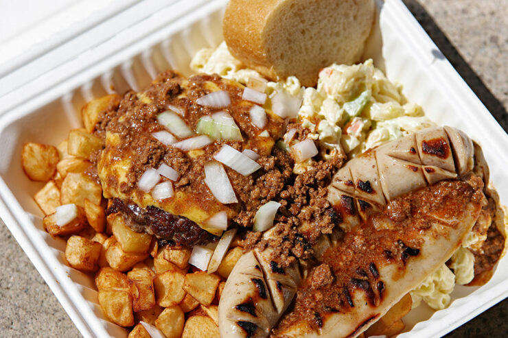 In Rochester, you’ll find White Hots—pale, unsmoked, and uncured sausage of beef, pork, and veal, served griddled—and that town’s infamous Garbage Plate.