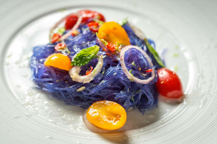 The gluten-free glass noodles in this cold dish are blue when they reach the table, then turned purple by a squeeze of citrus.