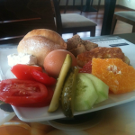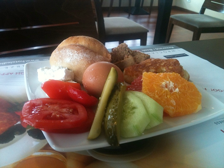 It’s usually a good sign when the breakfast in a hotel is offered on the top floor, rather than adjacent to the ground floor lobby. Here in Katowice, Oneida is treated to a remarkable spread that echoes our location perfectly: hard-boiled eggs, pate, pickled gherkins, pickled red peppers, sliced oranges and blood oranges, slabs of mild white curd cheese, dense and sweet drop scones, sliced tomatoes and cucumber. All of this is complemented perfectly by a hot black coffee that is probably the best filter/drip coffee that we’ll enjoy on the continent (the great espresso will come tomorrow, in Vienna!).