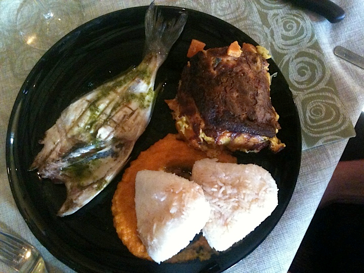 The stage at Hana-Bi is wood, and low. It’s just a step up from the sand at the edge of the mostly outdoor restaurant, tucked under a wood and thatch roof, and dunes rise around the stage and audience area. We load our equipment in, wrangle some parking, and pry loose some mojitos from the bar as we wait for dinner. When it comes, we’re seated, all together, friends, hosts, band, at one long table readied with wine bottles, glasses, and cutlery. The meal arrives all in one course – the restaurant, confident in its cosmopolitan singularity, departs from the prim-secondo pattern that many of our Italian meals have followed – and it’s remarkable (as the food here always has been when we visit). There are thick slabs of a kind of quiche, or a baked custard (too hearty and dense to class as a soufflé) studded with fresh seasonal vegetables, next to boat-shaped patties of sushi rice drizzled with tamari and a pumpkin reduction. Alongside, on each plate lies a grilled whole fish – I’m too swept up in the meal to ask the species, but it’s a slender, flaky white fish with a heady aroma, and the bones slip so easily out that mine is filleted and devoured within minutes, accompanied by a crackling Trebbiano di Romagna white wine that seems to light the room.
