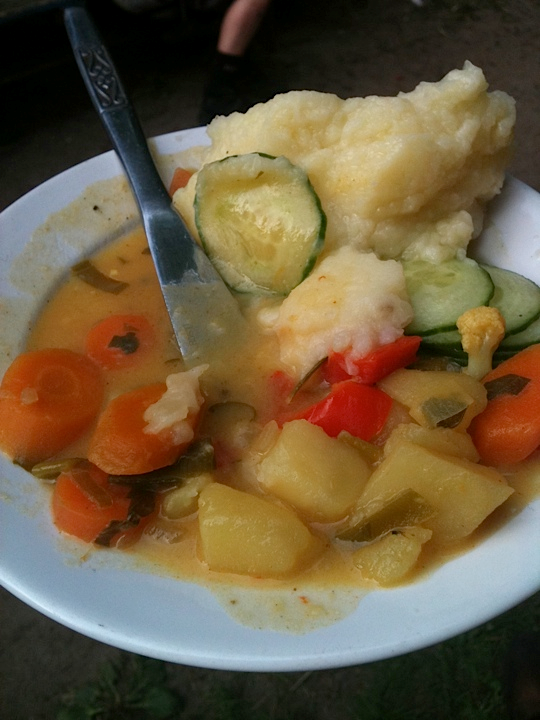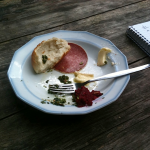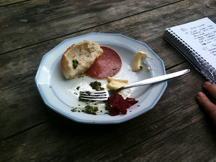 We set out from Berlin for Katowice, in the south of Poland, where we will be performing at the OFF Festival, a vast conglomeration of popular bands, professional catering, port-a-johns, and modular backstage units; a potent contrast to the laissez-faire experience of Sommerfest. Still, it turns out to be a total delight (despite gusty rainstorms): smoothly organized, enthusiastic audience and festival staff, and great food in the catering tent. I move through a cafeteria-style buffet line, pointing at things that look good and trying to fill my plate with as many different items as I can. At the end of the line, I turn in the meal ticket I’ve been issued, and retreat to a table to assess my bounty: Mushroom pie, stewed cabbage, chopped beets, sliced cucumbers, a pale-green herbed rice with mint, some sort of crepes, a bowl of thick vegetable soup, and a massive slab of plum cake dusted with powdered sugar. All of the food is excellent – freshly prepared from local, seasonal ingredients – and for me, the highlight is the tangy, crumbly plum cake that rings notes of familiarity in its resemblance to a typical American cobbler or crumble, but is executed just differently enough to remind me that I’m truly elsewhere. The crumb is pungent in a way I’ll quickly come to identify as Central European – this is a land of pickling and souring, as will become quite clear the next morning, at the finest breakfast I’ll enjoy on the tour.