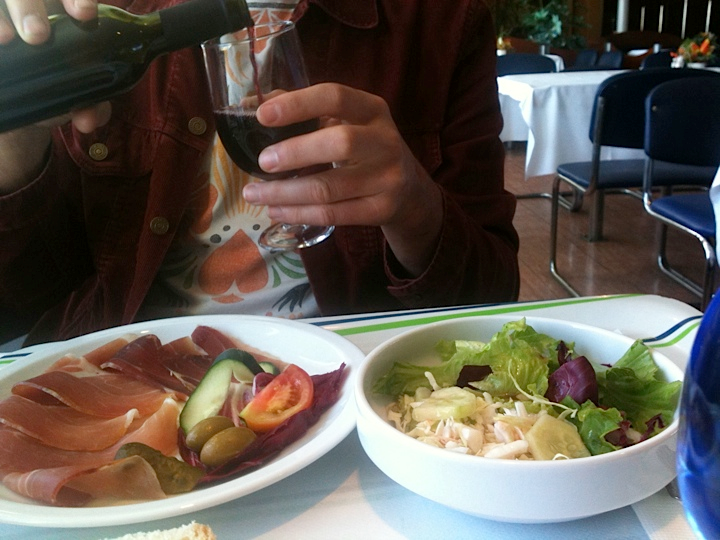 We dine, meet at the van, and pile in for the trip south to Vienna. We make a few planned and unplanned stops along the way, and roll into the club as a gentle evening rain coats the streets and sidewalks of the Prater. The club has been built in an unused pedestrian walkway beneath a traffic circle in downtown Vienna – all is concrete, underground, dark and enigmatic. We love it, although we’re also aware that our extreme volume is likely to be magnified beyond endurance in such a harsh acoustic atmosphere…..but who cares, check out the local cheeses, mustard, bread and wine backstage! I’ve enjoyed plenty of Austrian white wine (particularly the inescapable Gruner Veltliner), but I’m unfamiliar with the dry, robust red called Zweigelt that has appeared on our table backstage. When we express thanks and delight to Peter, the promoter of the show, he disappears into a cellar and returns with another bottle of Zweigelt from a different producer and an earlier vintage – where the previous bottles have been young and easily drinkable, this a more robust, complex wine. We are very happy.