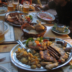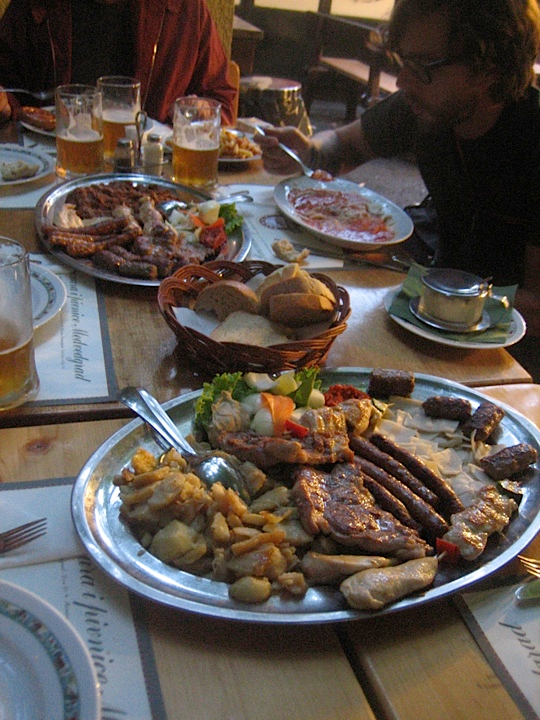 We’ve got the evening off in Zagreb tonight. This isn’t an ideal situation from a financial or musical perspective, but for enjoying ourselves and relaxing in a completely new atmosphere, it’s a pleasant diversion from the typical tour schedule. After checking into our hotel in a sleepy backstreet corner of the city, we ask the desk host where she would recommend that we eat dinner. My Croatian is fairly rusty, so I’m pleased that she speaks excellent enough English that we can have a meaningful conversation about food. Once I explain that we’re looking for excellent local food, and we are not particularly hung up on how fancy it seems, she brightens and says she knows exactly the place we should go. Four points in its favor right away: we can sit outdoors, it’s cheap, they brew their own beer, and it’s a five-minute walk from the hotel. As a crisp, late-summer dusk falls, we stroll a few city blocks, into and then across a small, leafy park. Some local guys are playing ping pong at a concrete table in the park, and then we can see and hear the murmur of a few tables of people under the trees across the street, at the Pivnica Medvedgrad – a low-key, charismatic beer garden under a grove of old trees edging the park. The streets are mostly empty, the beer garden fills up as we sit and drink half-litre glasses of the house beer, a clear golden ale, and a welcoming, gray-haired server/proprietor brings us platters of grilled meats (assorted coiled sausages, marinated chicken, pork chops), baskets of housemade crusty breads, a plank of tangy local cheeses, grilled squid, marinated mushrooms, pots of spicy mustard, and plates of chewy knodel – irregularly rag-shaped housemade pasta that blends perfectly with the savory spread before us.