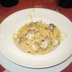 Welcome to Italy: perfect, crisp white wine; a spaghetti alle vonghole that features the tiniest, firmest, most perfect clams I’ve ever had in this personal favorite dish; and then for the next course platters of stuffed squid of an unusual variety, with fist-sized, barrel-shaped bodies and stubby tentacles. The squid are accompanied by peas in a salty, complex tomato broth, studded with chunks of diced squid. All of us, led by our hosts and Italian friends, are requesting basket after basket of the plain, sober white bread offered by the restaurant, and mopping every platter clean. Double espressos all around, and somehow we’ve killed two hours here – we have to be on stage in 5 minutes. We whisk back through the passageways, onto the stage, and the second half of the night begins.