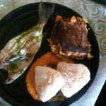 The hotel turns out to be part of a huge resort, complete with swimming pool, water slides, and amusements for little kids. The relentless pulse of Eurotrance beats floats muffled on the sea breeze at all times. We are seated in the hilarious “Dalmatian Village” – an outdoor replica of an ancient village, replete with circular open hearths, split-log seats and tables, and stone-and-timber huts. We’re perplexed and amused, and if I were at Epcot Center I would run screaming for another dining option. But as the proverbs say, when in Dalmatia…