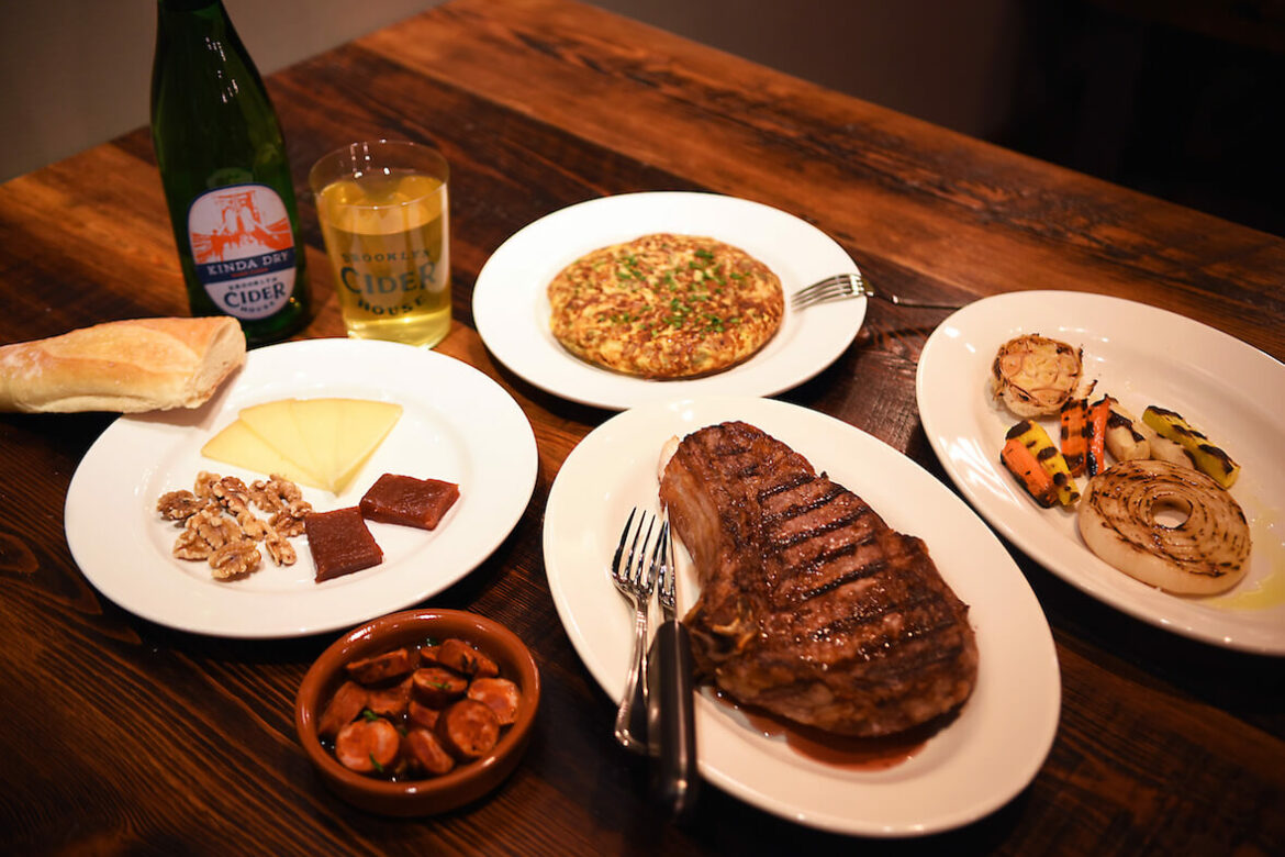What will you be eating? Five well-portioned courses served family-style, over two and a half hours, that are either omnivorous ($37) or vegetarian ($32). For an additional $15, you get the mid-course cider tastings straight from the barrels with expert explanations; at the end, you choose your favorite from among the differently aged selections. The cider complements all the food, from vegetable dumplings to tortilla de bacalao to steaks of either ribeye or cauliflower, both keeping you in balance. Manchego, quince paste and walnuts round out each menu.