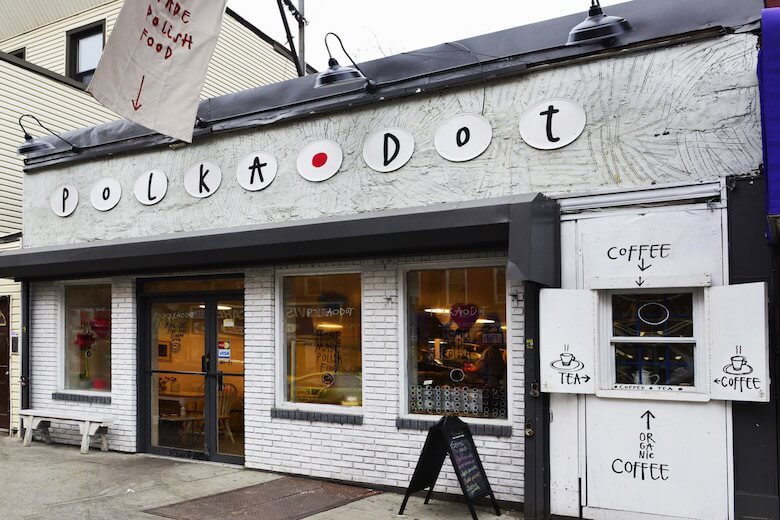 Located across the street from the famous Peter Pan Donut & Pastry Shop, where the line extends out the door and down the block most weekends, Polka Dot exudes its own distinct charm that stems from a fresh aesthetic rooted in simplicity. Above the entrance to the café, a white banner with a squiggly red font reads, “Homemade Polish food,” and potted geraniums flank the walk-up window boasting organic coffee and tea—one of the few in the neighborhood.